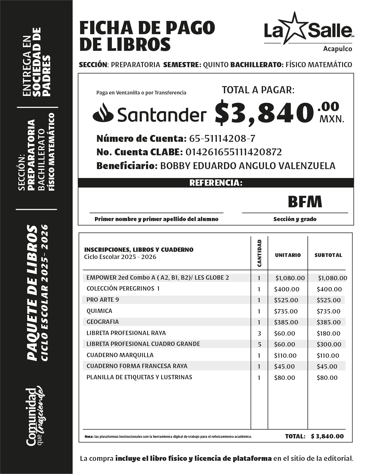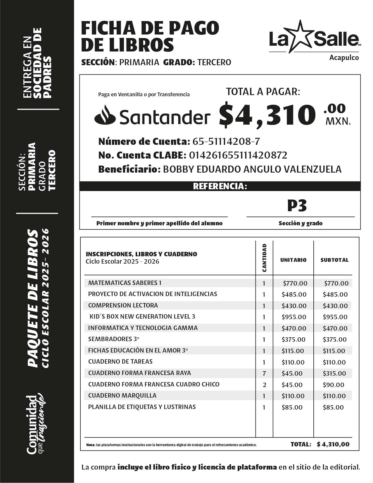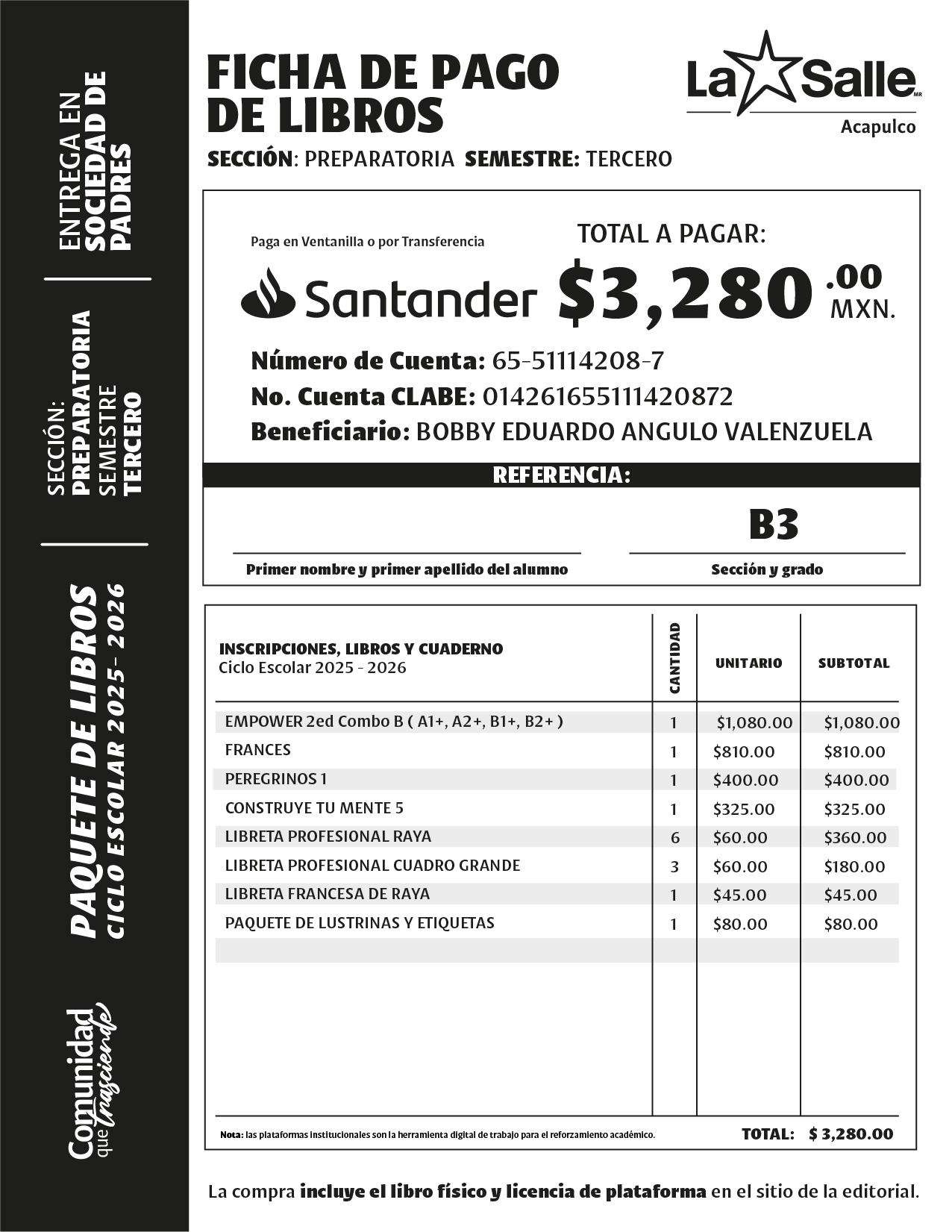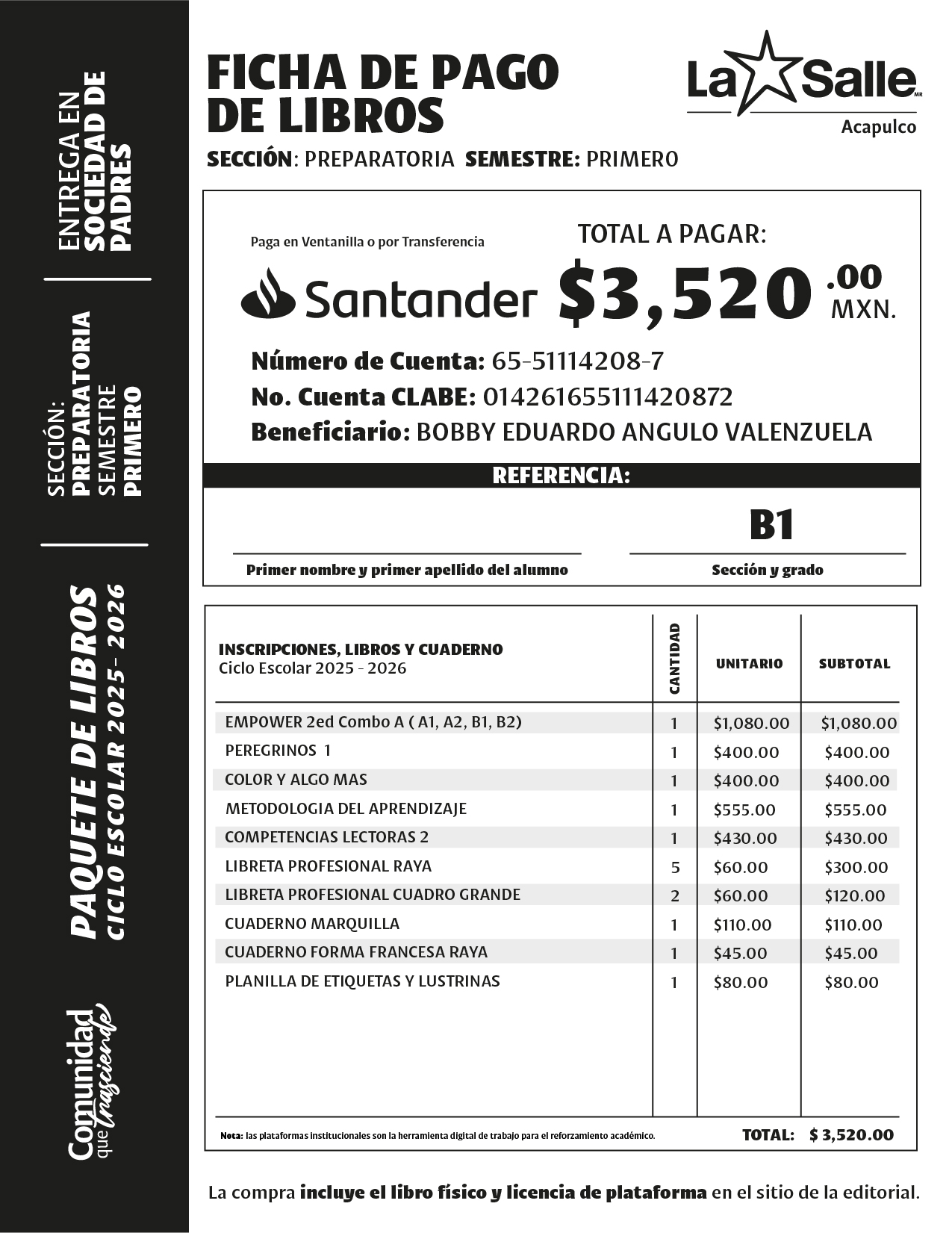b) Será de gran importancia hacer los pagos a la brevedad posible para que los proveedores de los materiales nos envíen los libros en tiempo y forma. (Sujeto a disponibilidad)