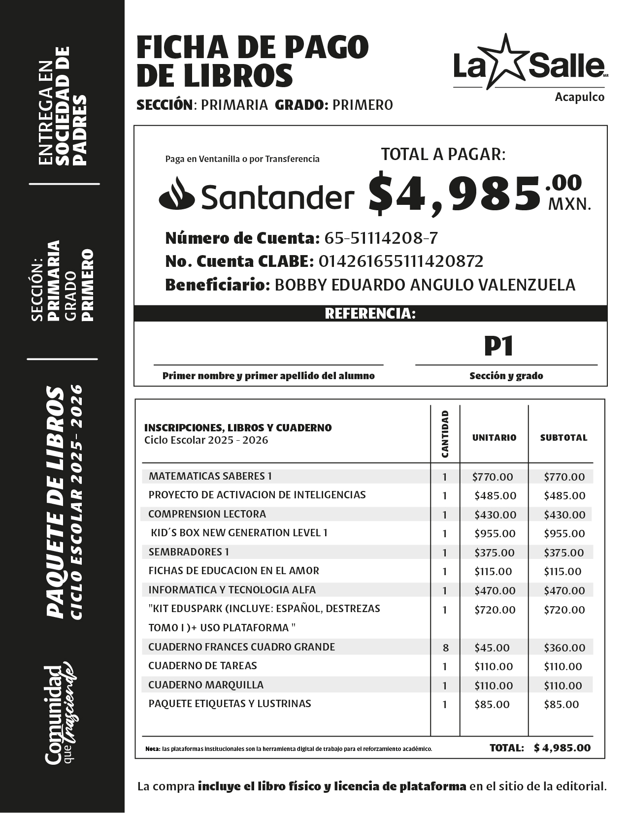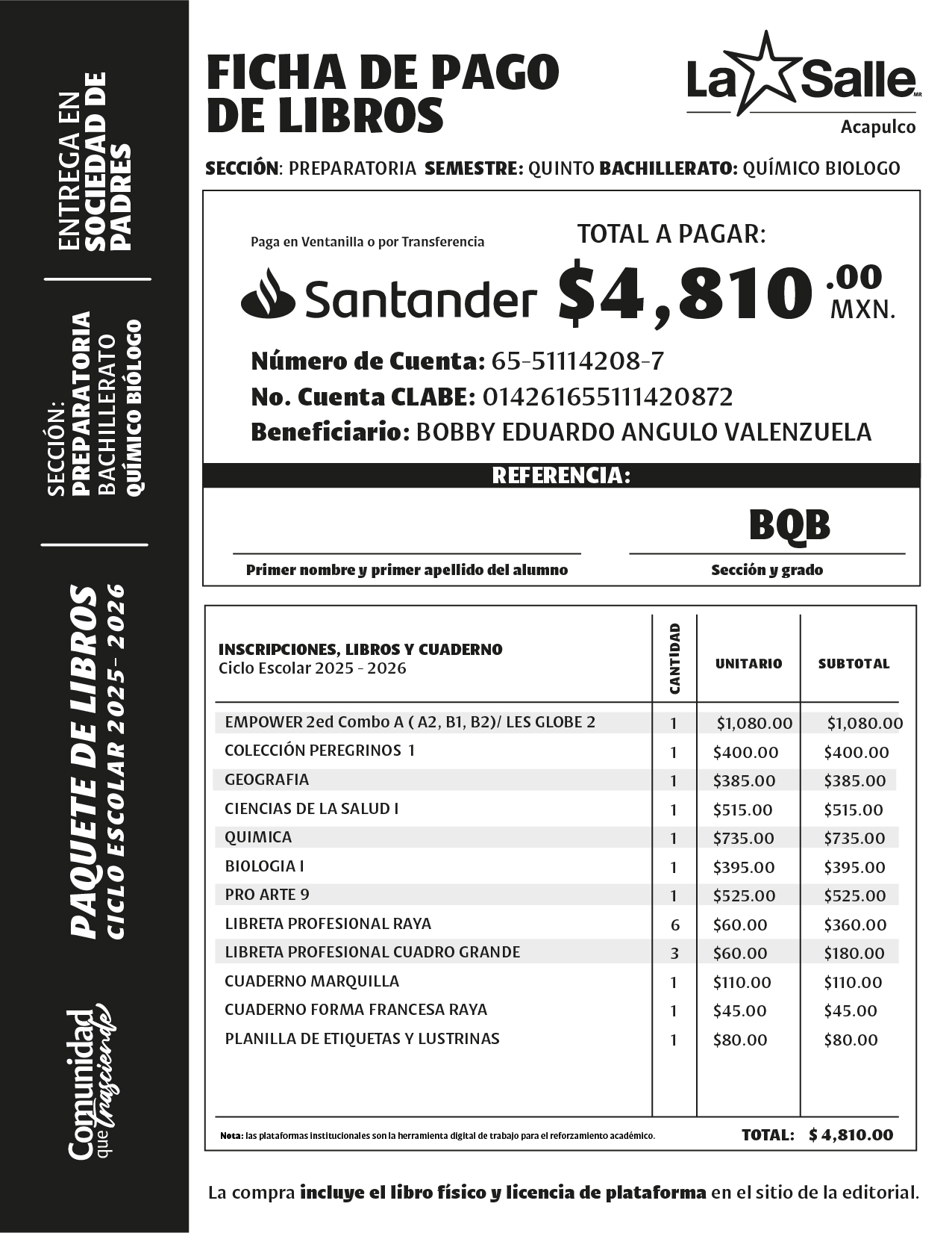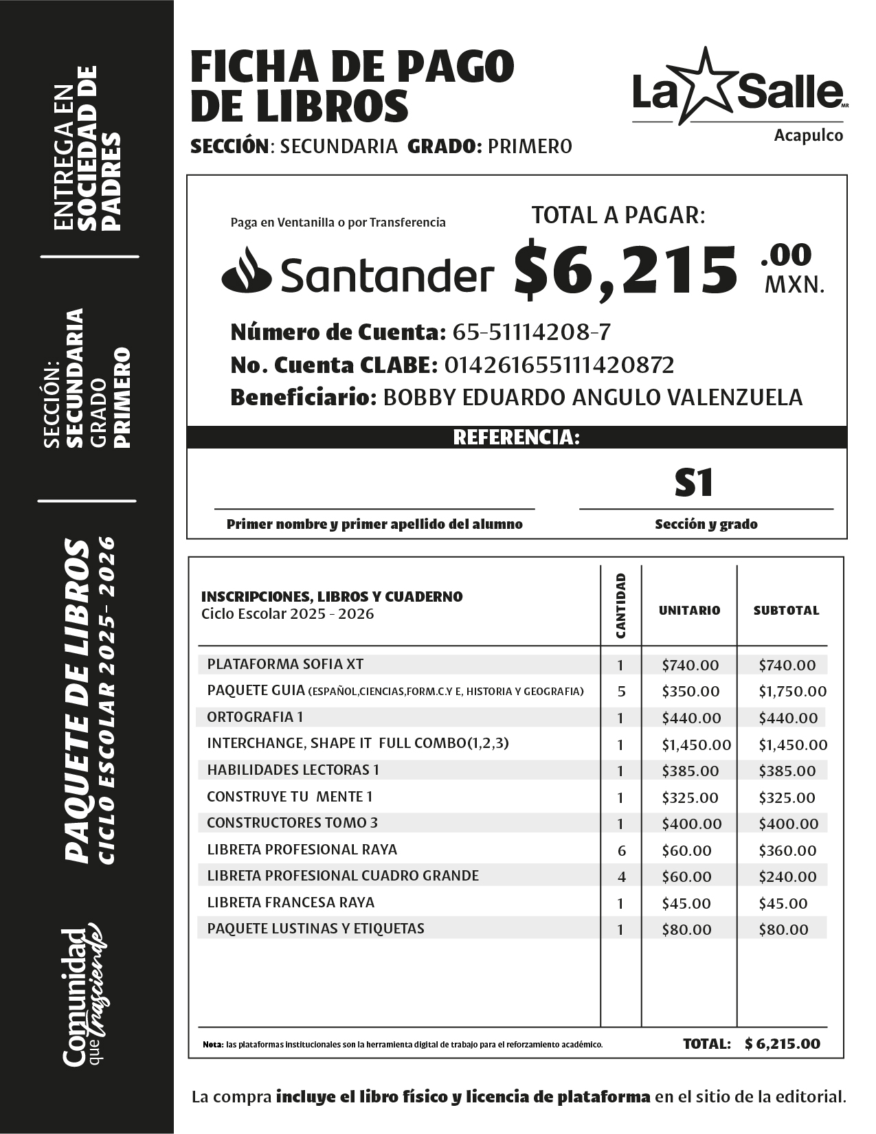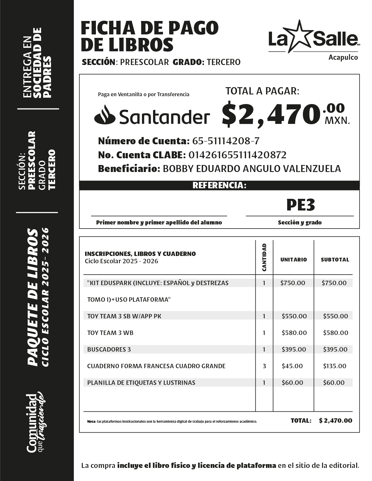 b) Será de gran importancia hacer los pagos a la brevedad posible para que los proveedores de los materiales nos envíen los libros en tiempo y forma. (Sujeto a disponibilidad)