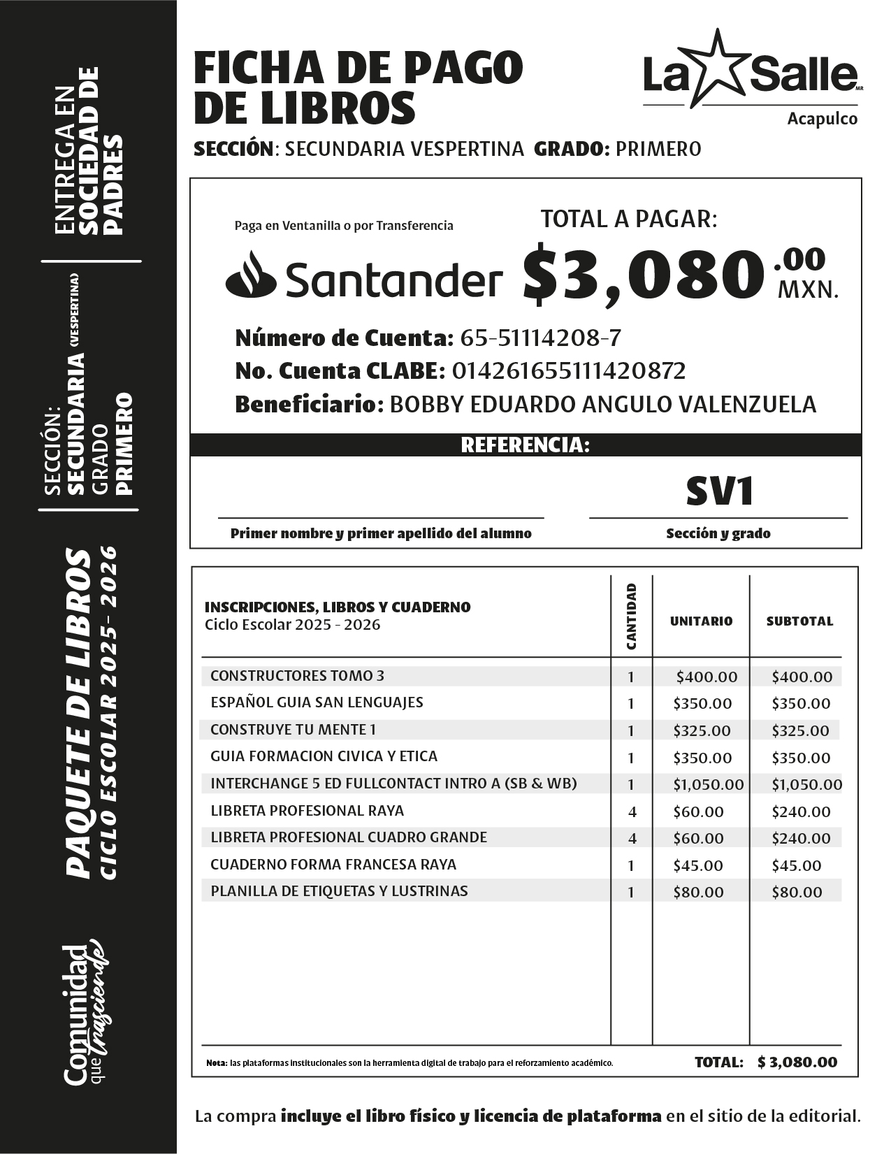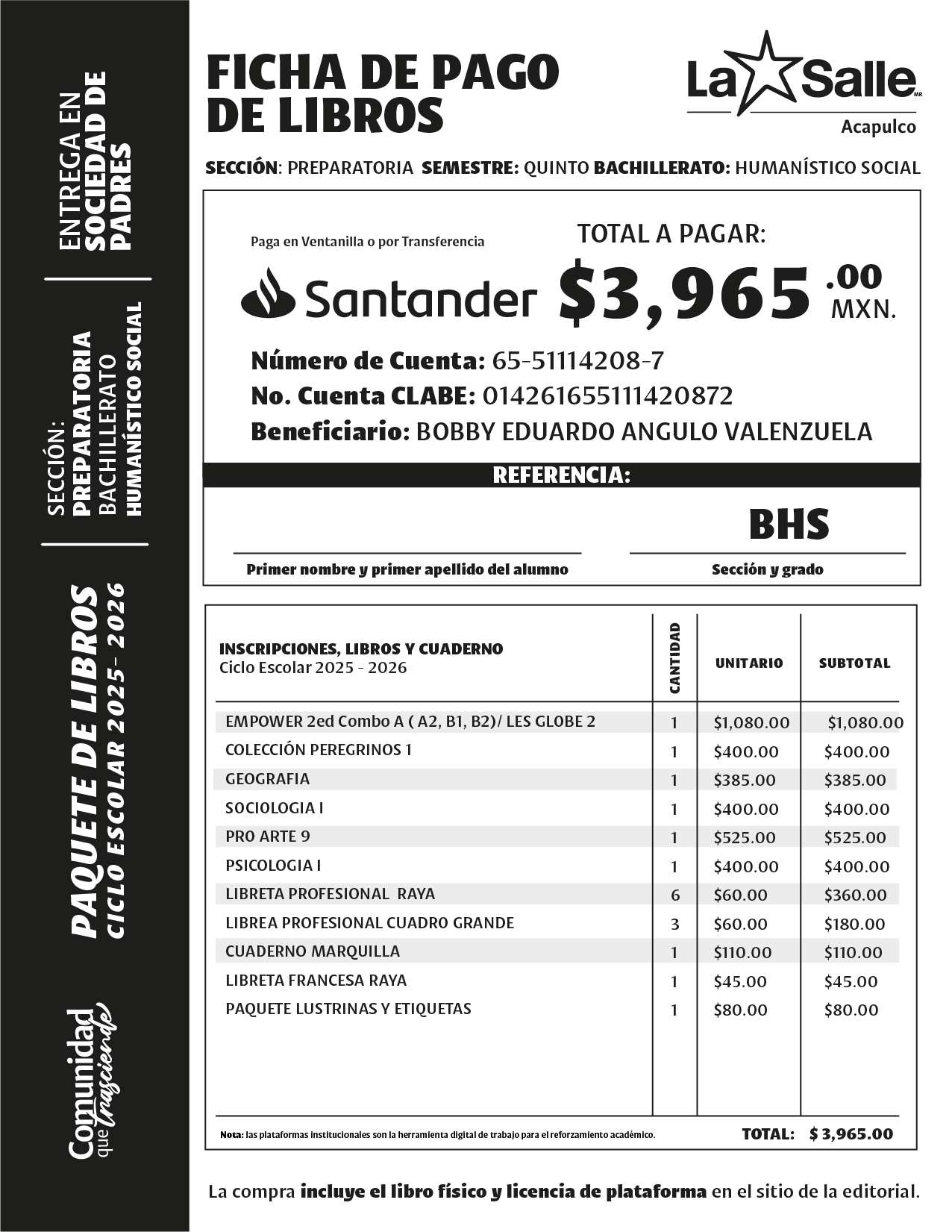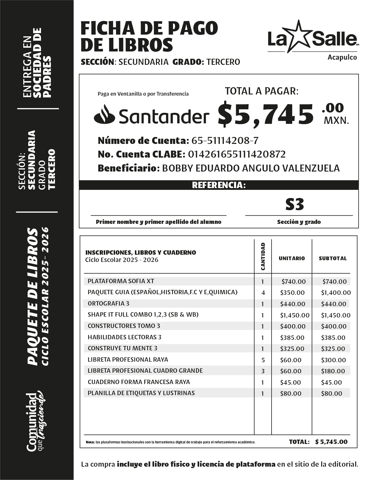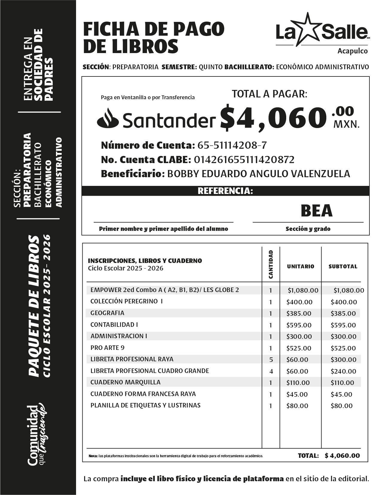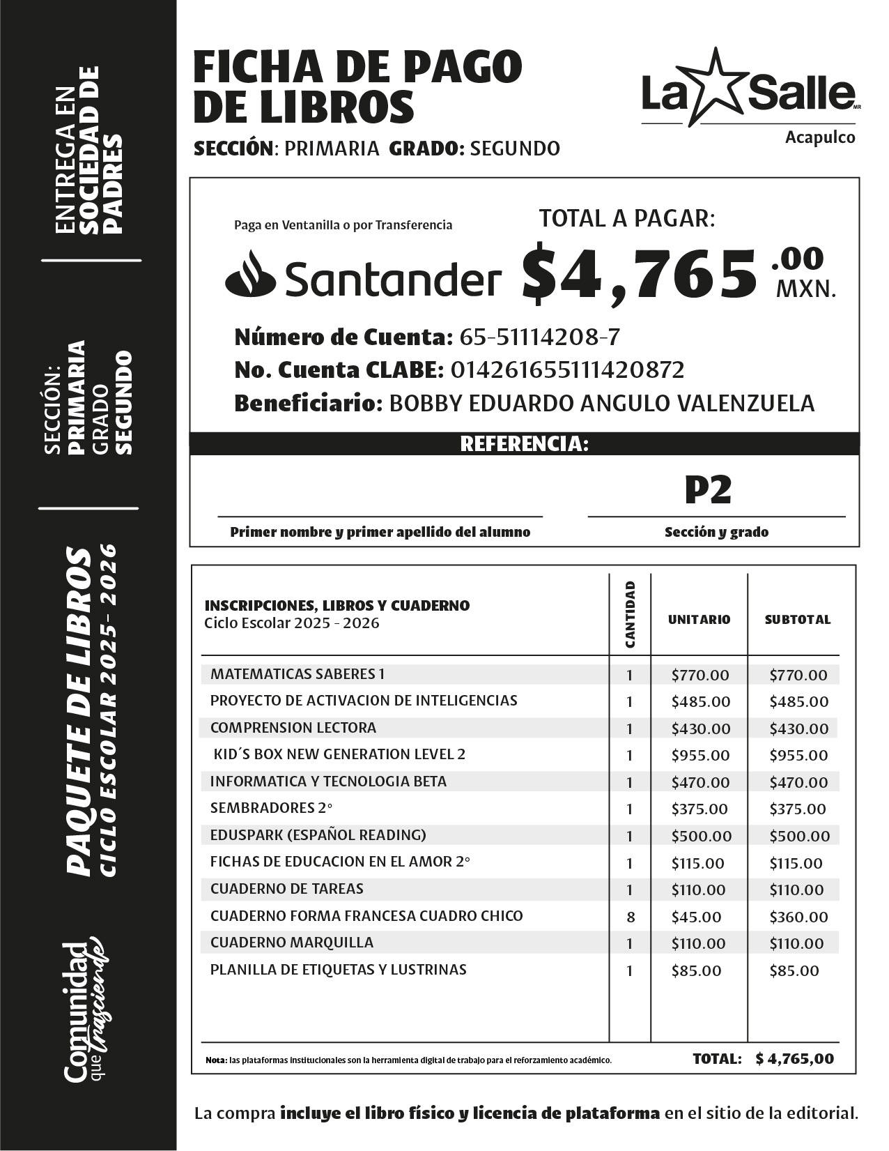 b) Será de gran importancia hacer los pagos a la brevedad posible para que los proveedores de los materiales nos envíen los libros en tiempo y forma. (Sujeto a disponibilidad)