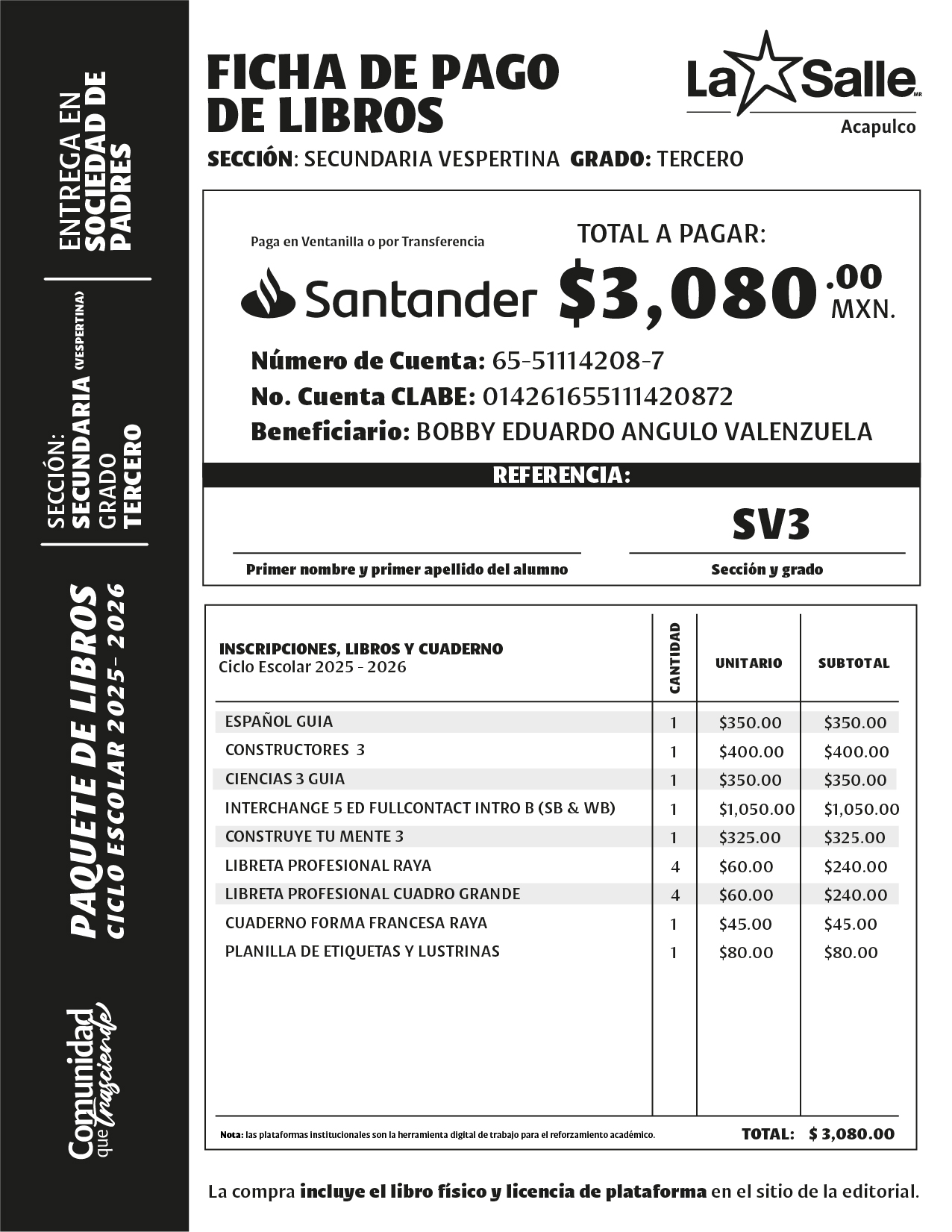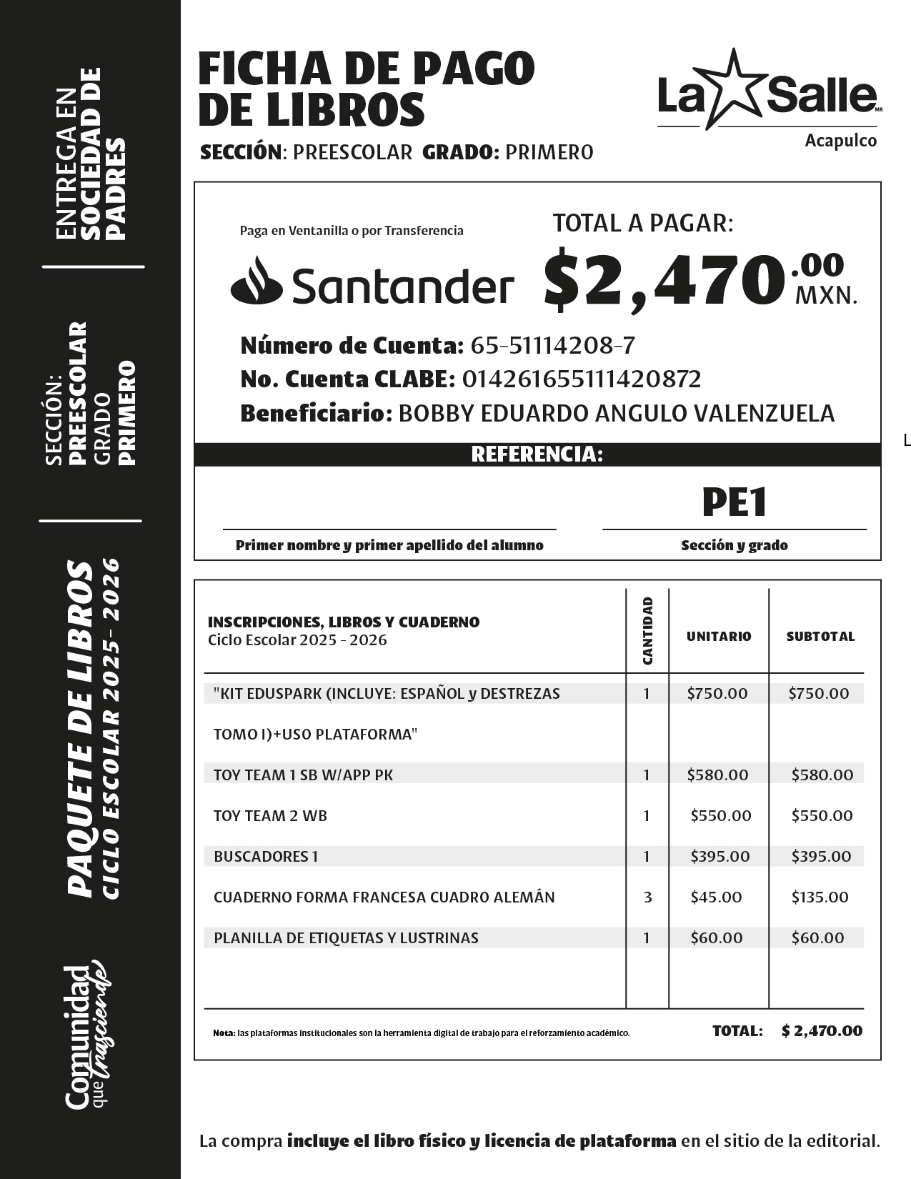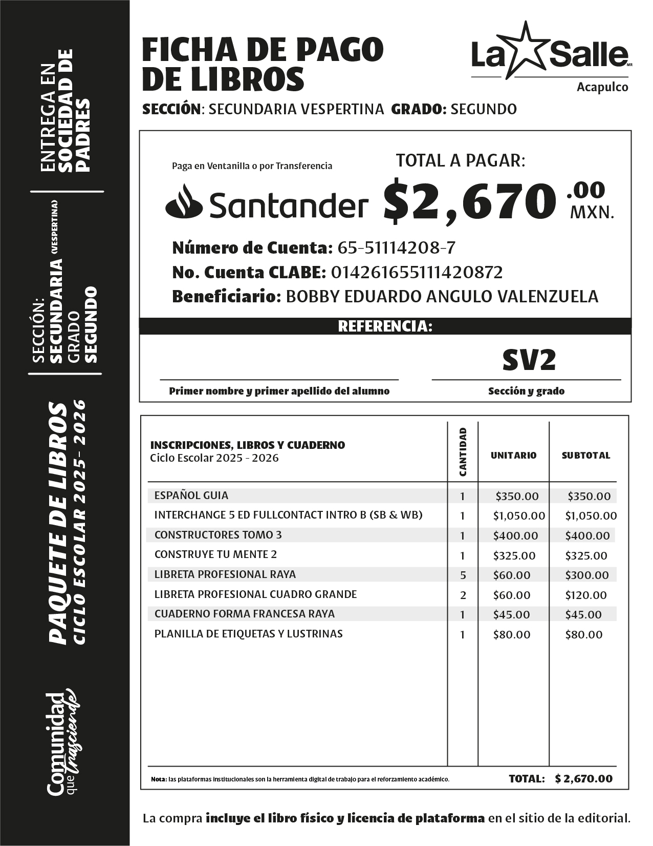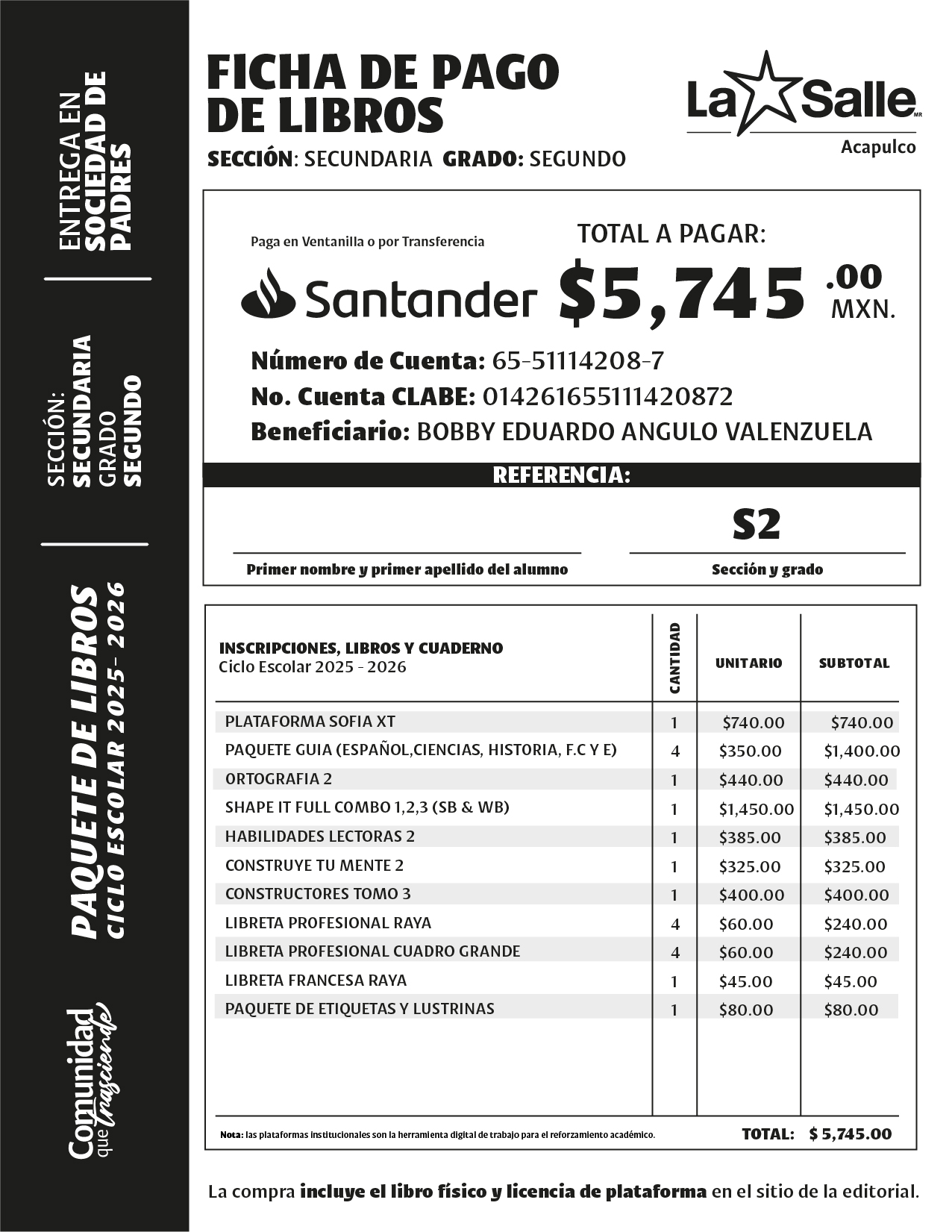 b) Será de gran importancia hacer los pagos a la brevedad posible para que los proveedores de los materiales nos envíen los libros en tiempo y forma. (Sujeto a disponibilidad)